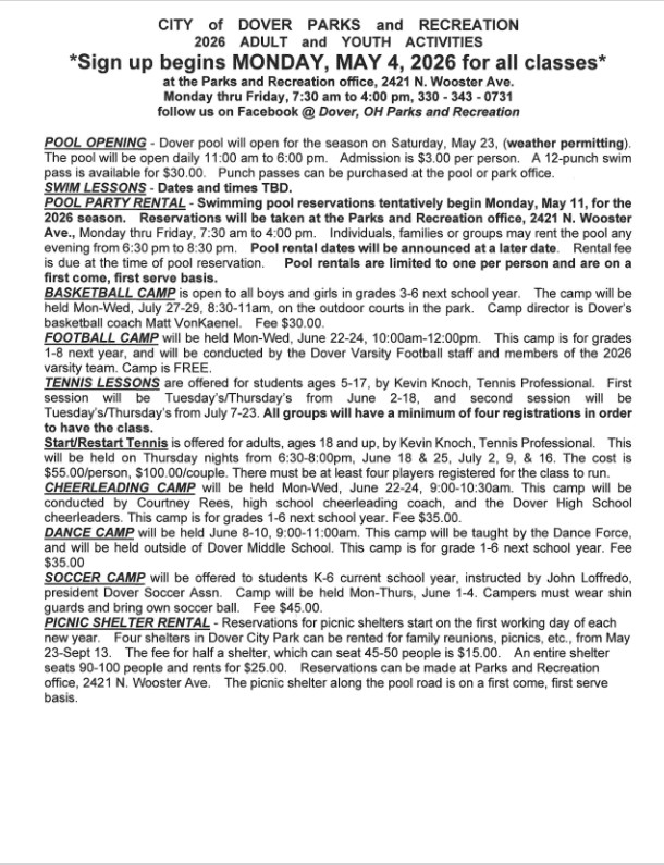 The City of Dover Parks and Recreation Adult and Youth Activities sign-ups begin May 4, 2026!