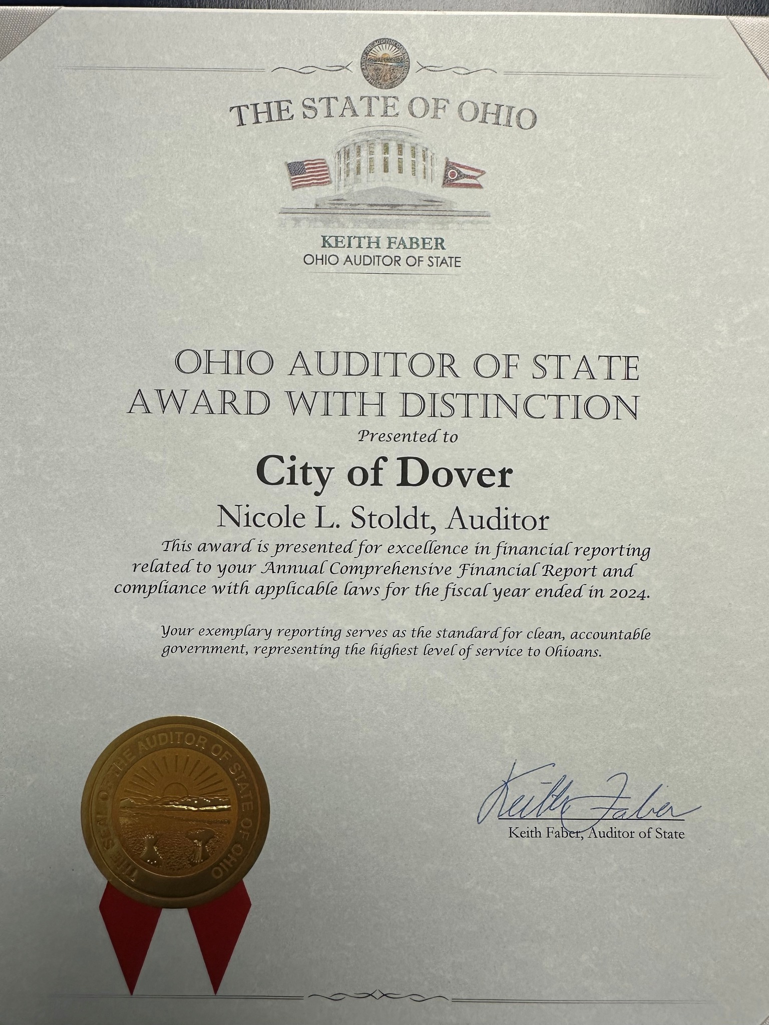 The City of Dover is proud to announce that we have received an Ohio Auditor of State Award with Distinction.